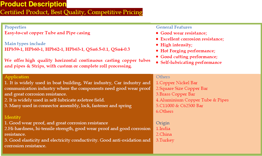 Copper Pipes / Tubes / Strips Product Details: Shape Round Color Red, Brown Payment & Shipping Terms: Price Get Latest Price Minimum Order Quantity: Negotiable Trial Order Port World Wide Packaging Details As per agreement Delivery Time As per agreement Payment Terms L/C, T/T