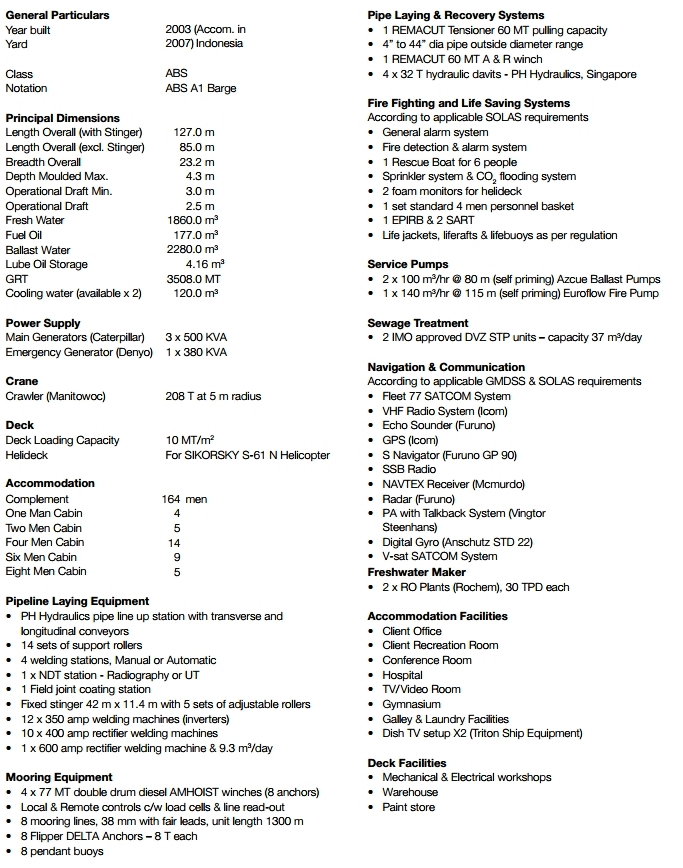 2003 BUILT 164 PAX ACCOMMODATION PIPELAY BARGE SALE - PLB, 127m LOA, NON DP, CRAWLER CRANE 208 T , NON PROPELLED
