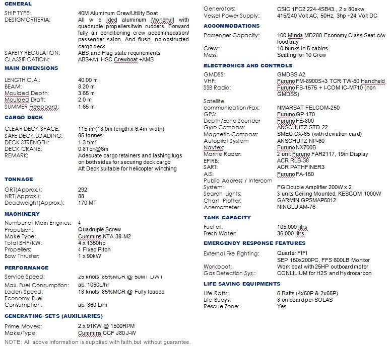 4x 40M ALUMINUM CREW UTILITY BOAT FOR SALE - 2014/2015 BLT, 100 PAX, 25 KNOTS