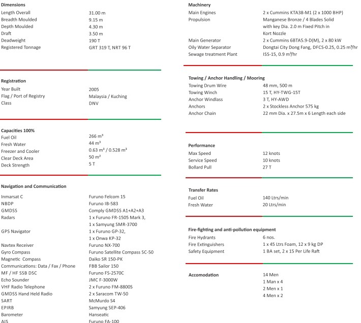 2000 BHP TOWING TUG FOR SALE - 2005 BLT, 31m LOA, 27 T BP, 14 PERSONS, NON DP, HARBOUR TUG