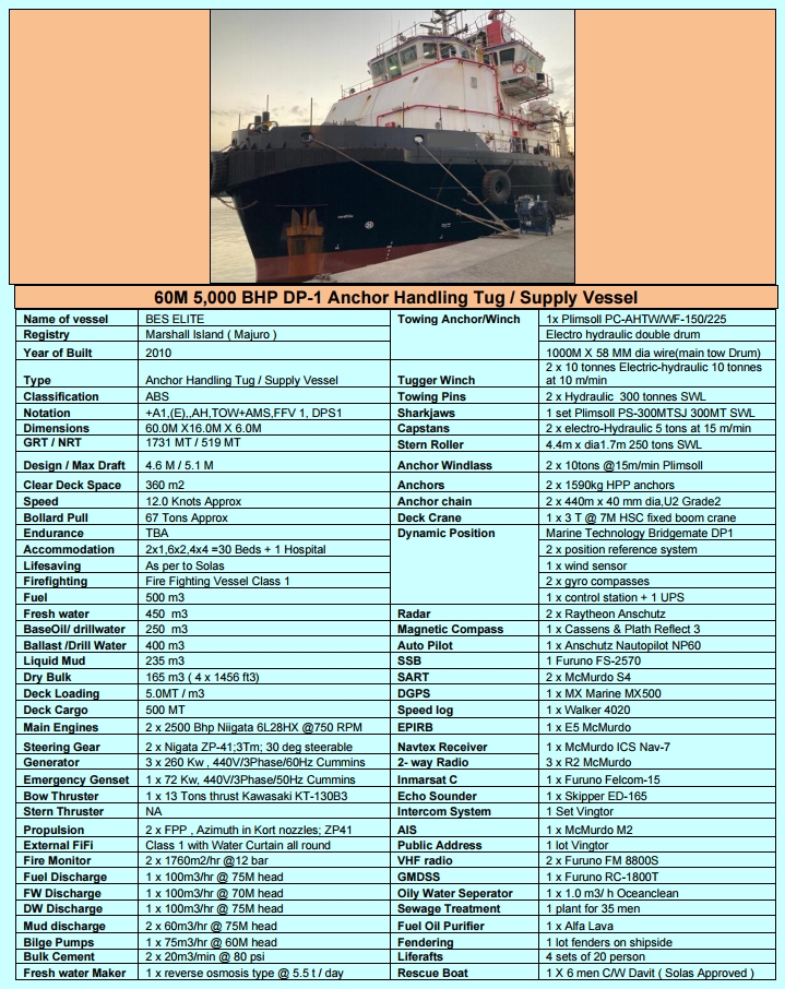 2010 BUILT 60M 5000 BHP DP1 AHTS - CECILIE KSHE IS CURRENTLY OPERATING IN ABU DHABI AND WILL BE AVAILABLE FOR SALE IN JAN 2023.