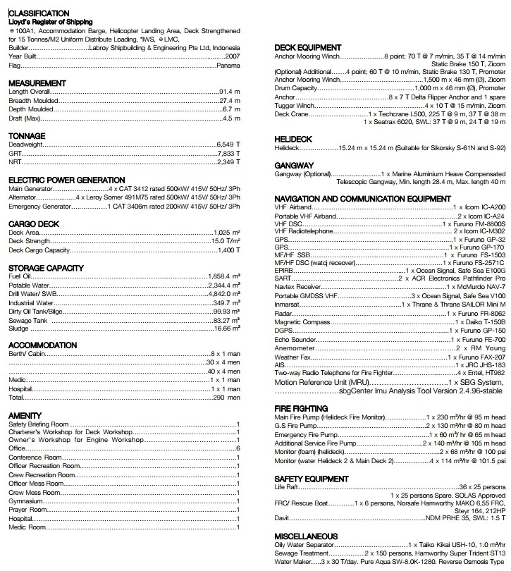 ACCOMMODATION WORK CRANE BARGE FOR SALE - 2007 BLT, 225 T CRANE, 91.4m LOA, HELIDECK, 290 PERSONS, 15 T PSQM DECK STRENGTH, NON-PROPELLED, NON-DP, 8 P.M.
