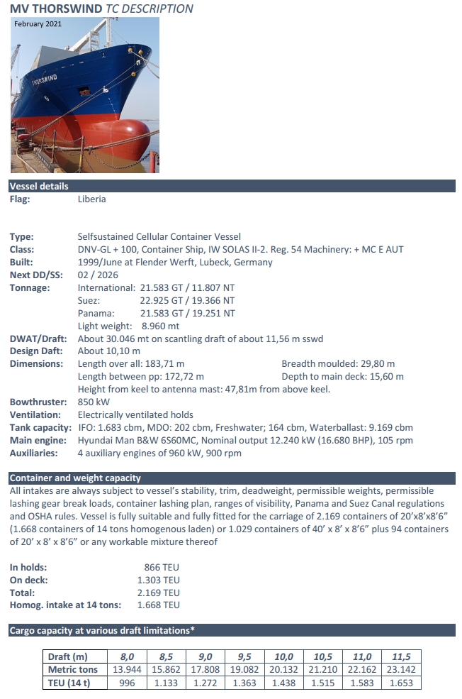 MV THORSWIND2169 TEU NOMINAL / 1661 TEU AT 14 TS HOMOG. / 420 RFS