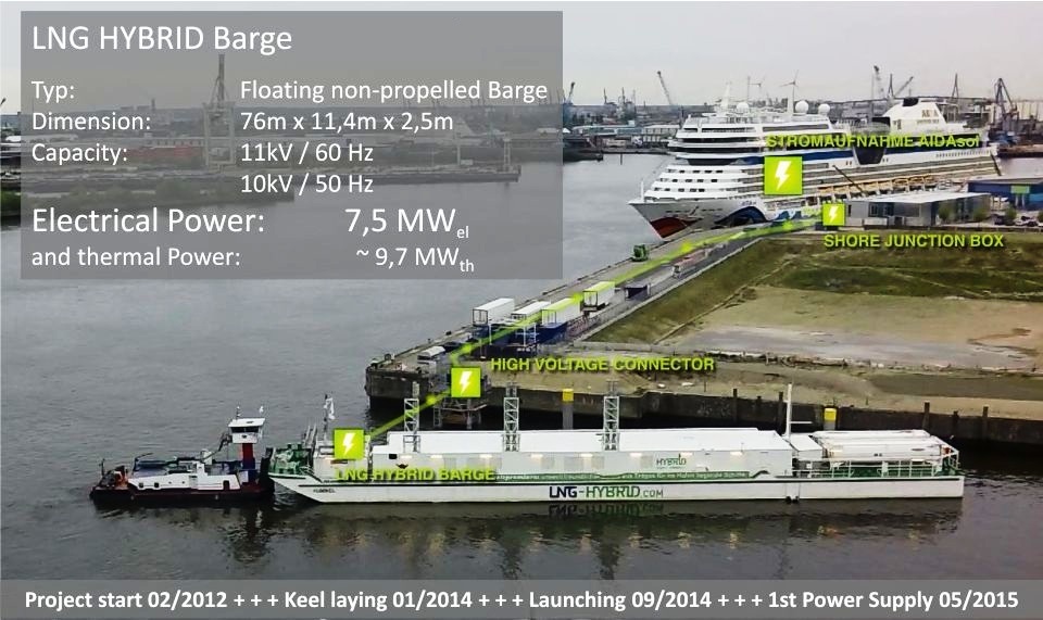 THE POWER BARGE WAS ORIGINALLY DEVELOPED TO ENABLE VISITING CRUISE VESSELS TO POWER DOWN MAIN ENGINES IN PORT, REDUCING FUEL USE AND POLLUTION, WHILST RETAINING FULL ELECTRICAL POWER TO ON BOARD SYSTEMS. THE BARGE IS CAPABLE OF GENERATING A TOTAL OF 7.5 MW OF POWER FROM 5 SILENT GENERATORS WHEN CONNECTED TO A LOCAL GAS SUPPLY. THE SYSTEM CAN ALSO USE RENTED LNG TANKS ON BOARD.