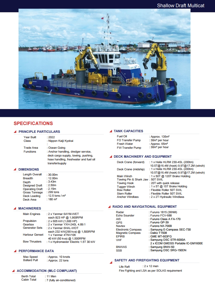 FOR CHARTER OR SALE - SHALLOW DRAFT MULTICAT SHIP - 2022 BLT, 30m LOA, 1646 BHP, OCEAN GOING, 22 T BP, 11 PERSONS, 2x10.5 T CRANE,