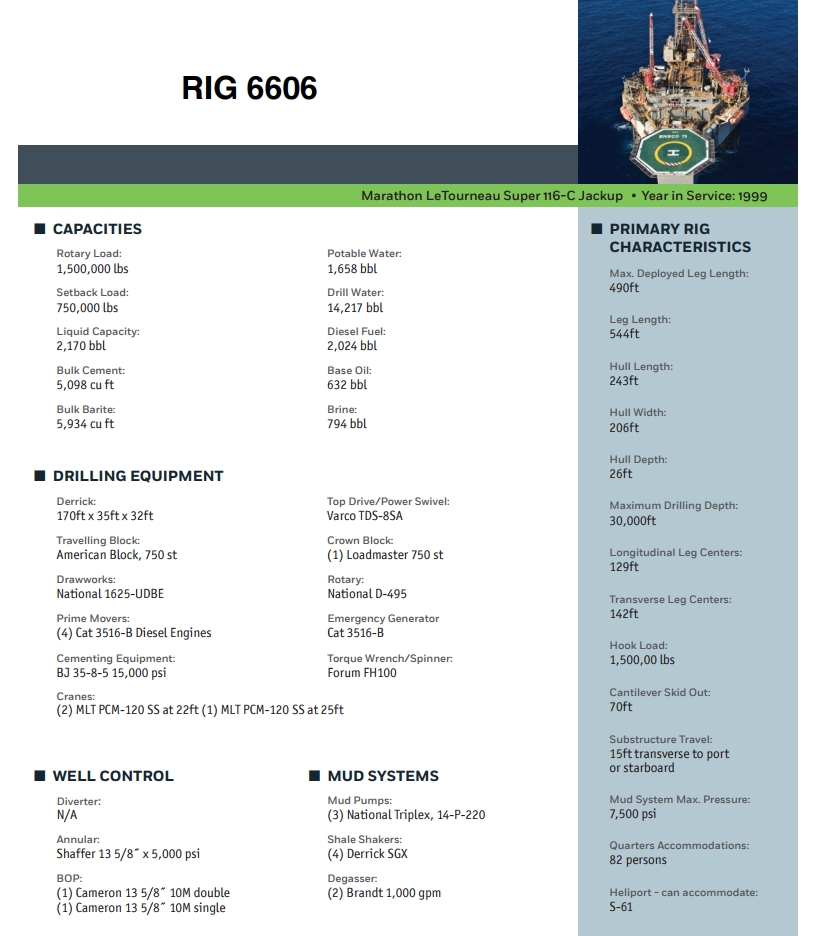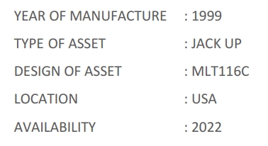 JACK UP RIG LETOURNEAU 116-C FOR SALE – 1999 BLT, 82 PERSONS. 30K FT DRILL DEPTH, 490FT WATER DEPTH, HELIDECK