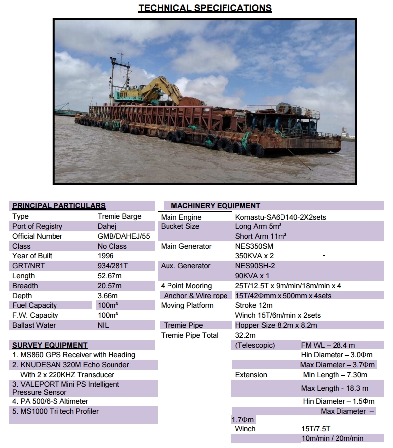 NON PROPELLED CUTTER SUCTION DREDGER + TREMIE BARGE FOR SALE - 2007/1996 BLT, 25m DREDGE DEPTH, 12000 CBM / 934 GRT, 52.67m LOA, SELF PROPELLED