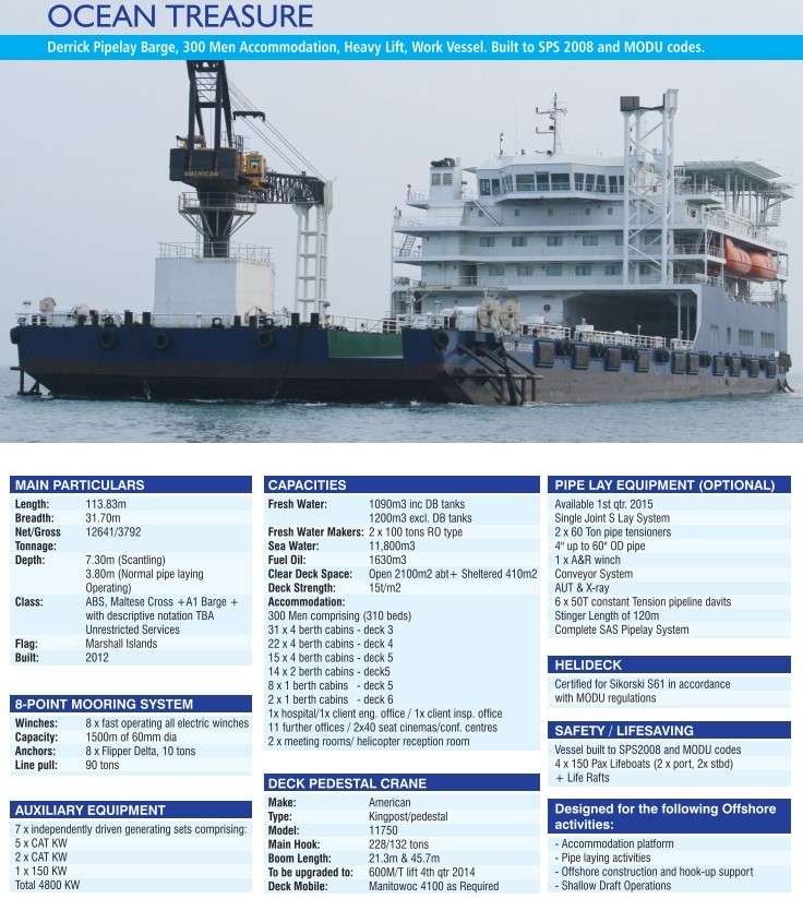 | OCEAN TREASURE | DERRICK PIPELAY BARGE | 2012 | 113.83 | UNKOWN | 2,100 | 300 | OUT OF CLASS | N/A | NIGERIAN | LAID UP |
