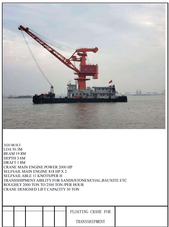 THIS SHIP IS A 49.8M CRANE SHIP, AND THE OPERATION AREA IS THE SEA NAVIGATION AREA. ITS MAIN PURPOSE IS TO BE RESPONSIBLE FOR LOADING AND UNLOADING YELLOW SAND, COAL MINES AND OTHER OPERATIONS. THE SHIP IS IN ACCORDANCE WITH THE "RULES FOR THE CONSTRUCTION OF SEA-GOING SHIPS ON DOMESTIC VOYAGES" (2018 AND 2019 AMENDMENT NOTICES) AND "STATUTORY SURVEYS OF SEA-GOING VESSELS ON DOMESTIC VOYAGES" TECHNICAL REGULATIONS (2011), "NOTICE OF AMENDMENT" (2012,2014,2016,2018) REQUIREMENTS ARE DESIGNED.